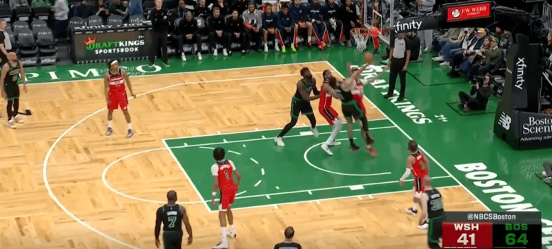 塔图姆提上和奎塔手递手接应,奎塔迅速溜入禁区,塔图姆利用萨尔的延误高吊篮下,奎塔对位低位的卡灵顿如入无人之境完成扣篮: