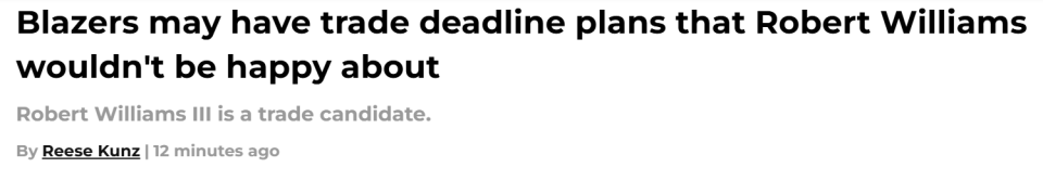 北京时间12月8日,据NBA名记Jake Fischer报道,相较于上赛季,开拓者预计会在2月6日交易截止日前,更愿意送走罗伯特-威廉姆斯。Fischer在文中写道:“据我所知,开拓者本赛季对交易罗伯特-威廉姆斯的意愿要高于上赛季,那时候球队还为这位伤病频发的内线球员设置了高额要价。”